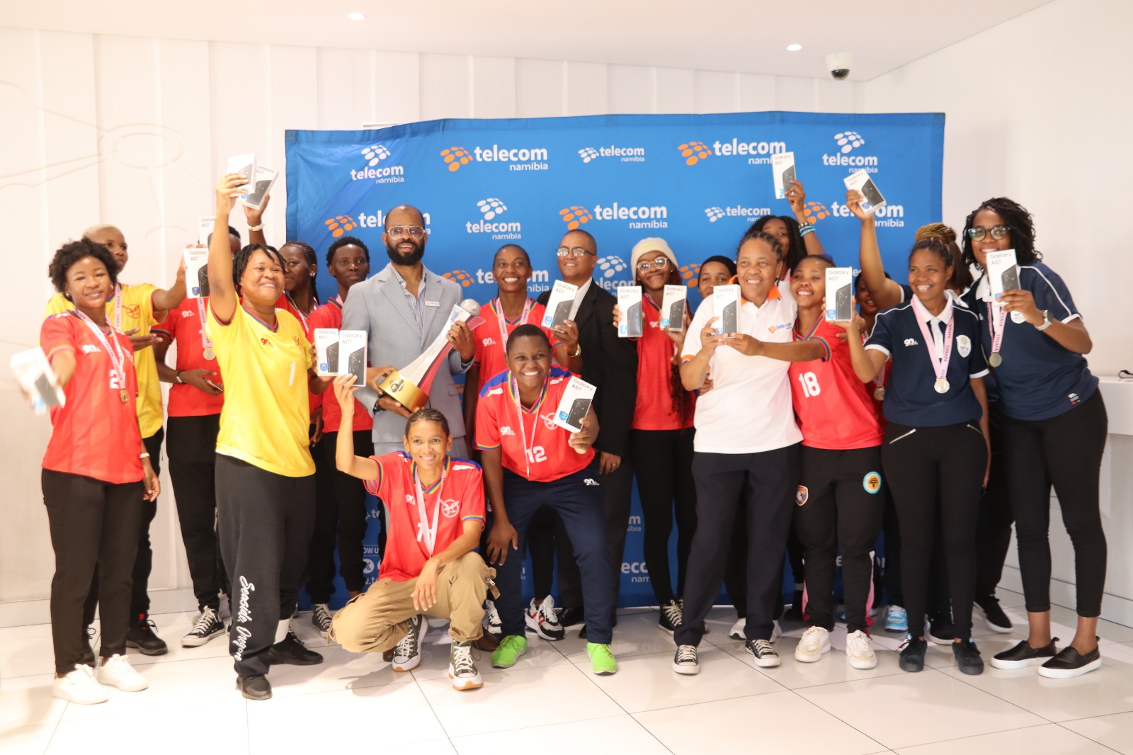 Telecom Namibia has rewarded the Brave Gladiators with 30 smartphones following their historic triumph at the Hollywoodbets COSAFA Women’s Championship.